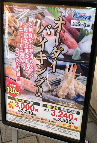 だんまや水産 だんまや水産は養老乃瀧の海鮮居酒屋。 全国展開している中価格帯の居酒屋。 全店で実施しているかは不明だが、メニュー全品 食べ飲み放題150分3564円という驚異のコースを 実施している場合がある。120分は3240円。 お任せ五種盛り 寿し5種盛り 厳選〆さば 秋刀魚刺し あじたたき 串焼盛り合せ 天ぷら盛り合せ いわし天 アジフライ 出し巻玉子 うずらスタミナ漬 エイヒレ ポテトフライ シーフードピザ 海鮮お好み焼風 塩焼きそば アイスブリュレ 全メニューなので、刺盛も寿司も天ぷらも含まれる。 これらが1人3564円なのは凄い。 — 2017/10 だんまや水産 戸塚東口店 神奈川県横浜市戸塚区吉田町118-1