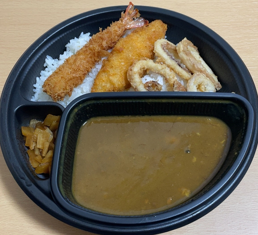 ポークカレー+エビフライ+フィッシュフライ(1本)+ハーフイカ+エビあさり