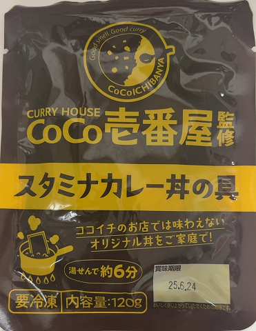 カレーハウスCoCo壱番屋監修 スタミナカレー丼の具 カレーハウスCoCo壱番屋監修 スタミナカレー丼の具 監修品なので、製造は秋田プリマ食品、販売は伊藤忠食品であり、 スーパーの冷凍コーナーで販売していた。 — 2025/03