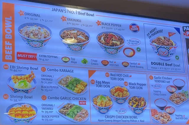 吉野家 インドネシア インドネシアの吉野家。 巨大ショッピングモールのレストラン街。 メニューはオリジナリティある。 BEEF BOWL ORIGINAL R 56000IDR(518円) 肉は軽くタレはやや薄味で20年くらい前の日本の吉野家を彷彿とさせる丼。 米が現地米でさらさらしていた。 チリソース/紅ショウガ/スパイス Taro Salted Egg Lava Ball 9000IDR(83円) タロイモボール Bag Small 4000IDR(37円) 持ち帰り用の不織布袋。 吉野家の国による微妙な違いは楽しめる。 — 2025/03 吉野家 MALL GRAND INDONESIA